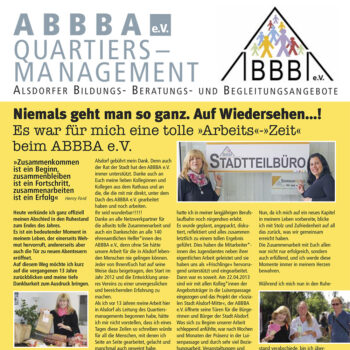 Auch in diesem Jahr erscheint der “Stadtteilbote für Alsdorf-Mitte” in der “und sonst?!” – dem Alsdorfer Stadtmagazin Freie Exemplare liegen an verschiedenen Orten in Alsdorf und eine kostenlose Web-Version im PDF-Format der ABBBA-Rubrik kann hier heruntergeladen werden. Die Themen dieser Ausgabe: Niemals geht man so ganz …! Ursula Wiemes geht in den Ruhestand Angebote und…